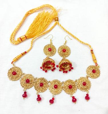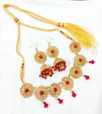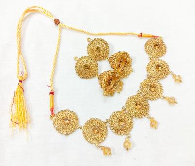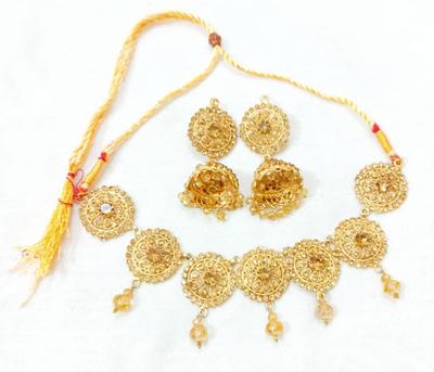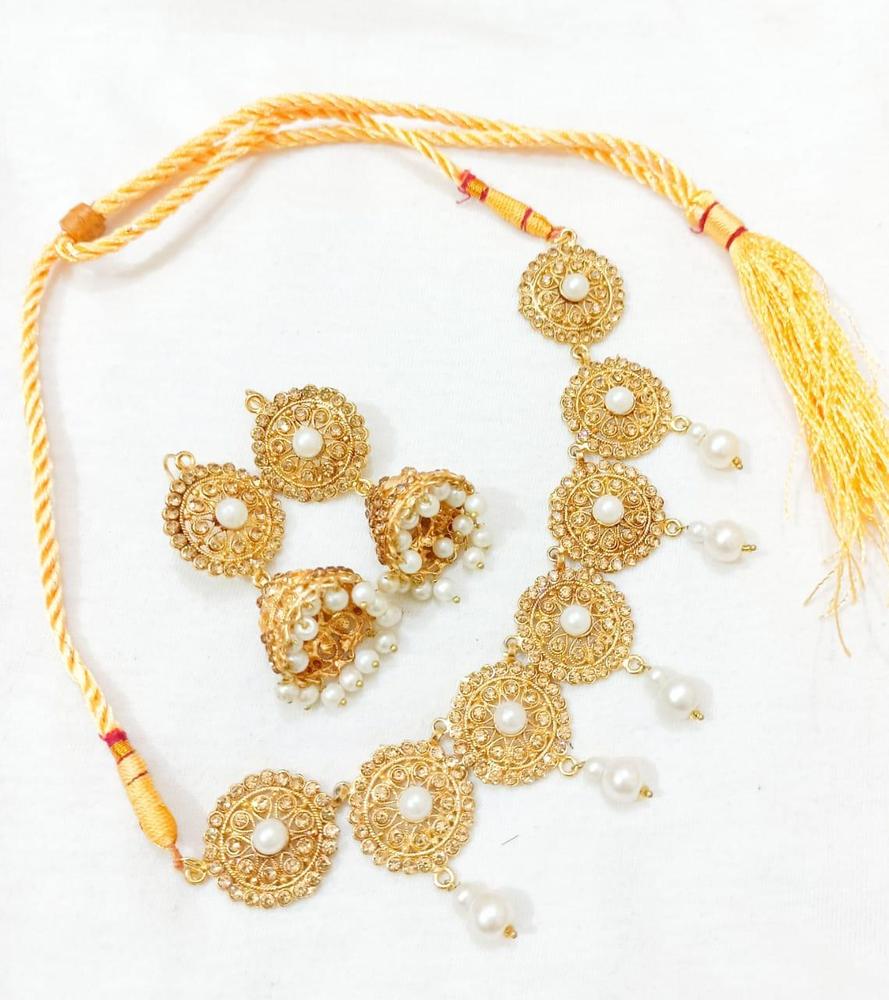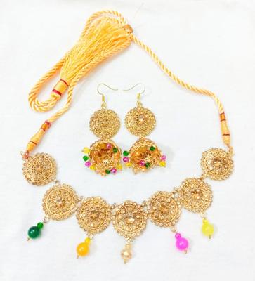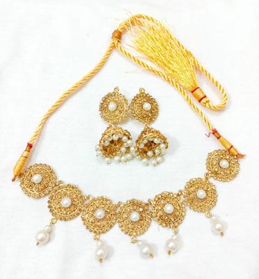 Material: Alloy• Plating: Gold Plated• Stone: Artificial Stones• No. Of Pieces: 2 Pcs• Package Includes: 1 x Choker, 1 x Earrings Pair• Helpful Info: Keep Jewellery away from water and chemicals|Remove during physical activities|Store separately in a soft pouch|There might be a slight color difference due to different light and monitor effect